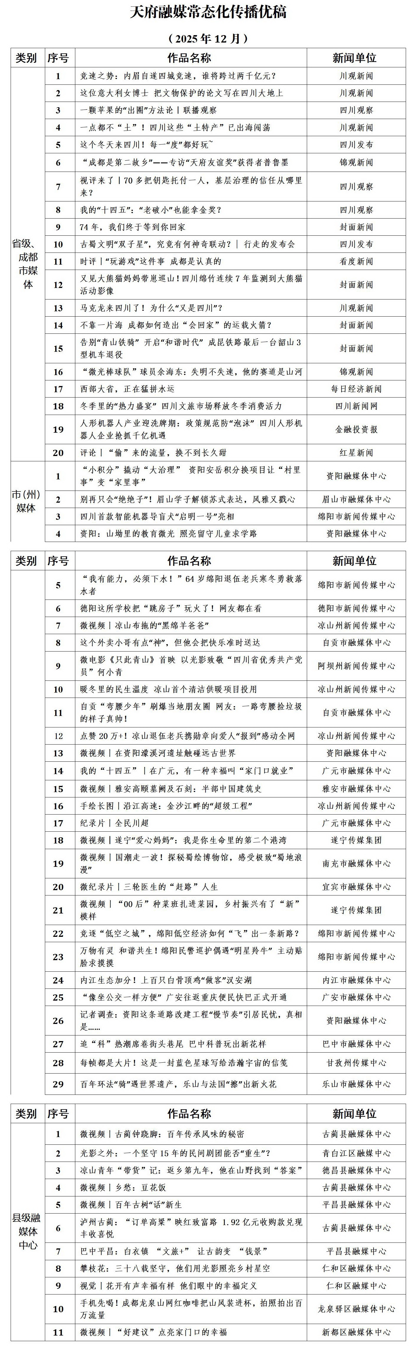 根据《关于开展天府融媒常态化传播优稿推选工作的通知》,天府融媒联合体指导组办公室组织天府融媒联合体轮值内容官,会同省记协评奖评优部,对2025年12月天府融媒联合体常态化传播的396条稿件进行了推选,共推选出60篇(件)优秀作品。现通过天融数治APP及四川记协网公布如下。